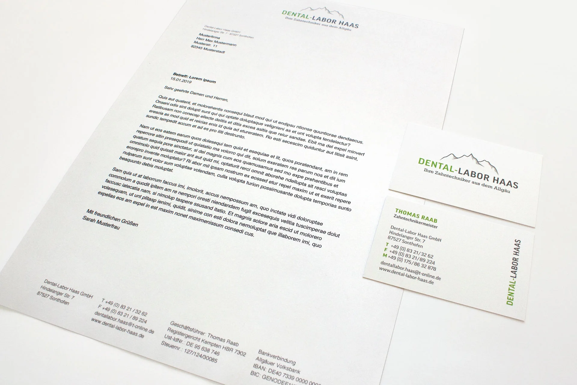 In Zeiten des technischen Fortschritts und Einsatz von CAD/CAM-Technologie und 3D-Scannern entwickelt sich auch die Zahntechnik ständig weiter. Mit einem Wechsel in der Geschäftsführung war die Zeit reif für ein Redesign und einen neuen visuellen Auftritt. Das Logo mit Grünten-Silhouette, das für die Regionalität und die lange Tradition des Dental-Labor Haas steht, wurde nur leicht modifiziert. Klare, moderne Typografie, ein frisches Hellgrün statt dunklem Rot und viel Weißraum schaffen ein helles, leichtes Erscheinungsbild. Der ästhetische und cleane Look des neuen Corporate Designs verkörpert damit den Anspruch des Labors: zahntechnische Leistungen auf allerhöchstem Qualitätsniveau und Präzision bis ins letzte Detail.