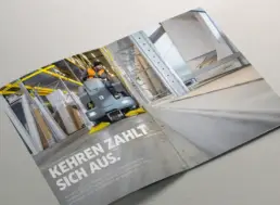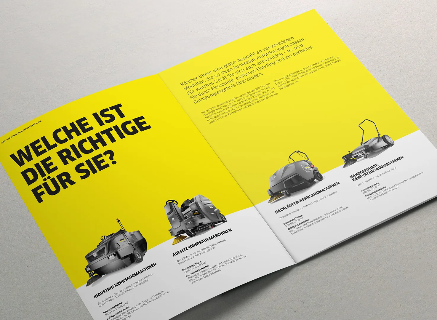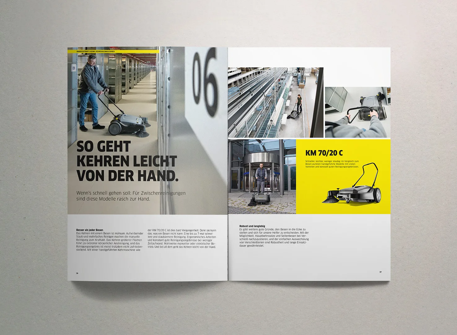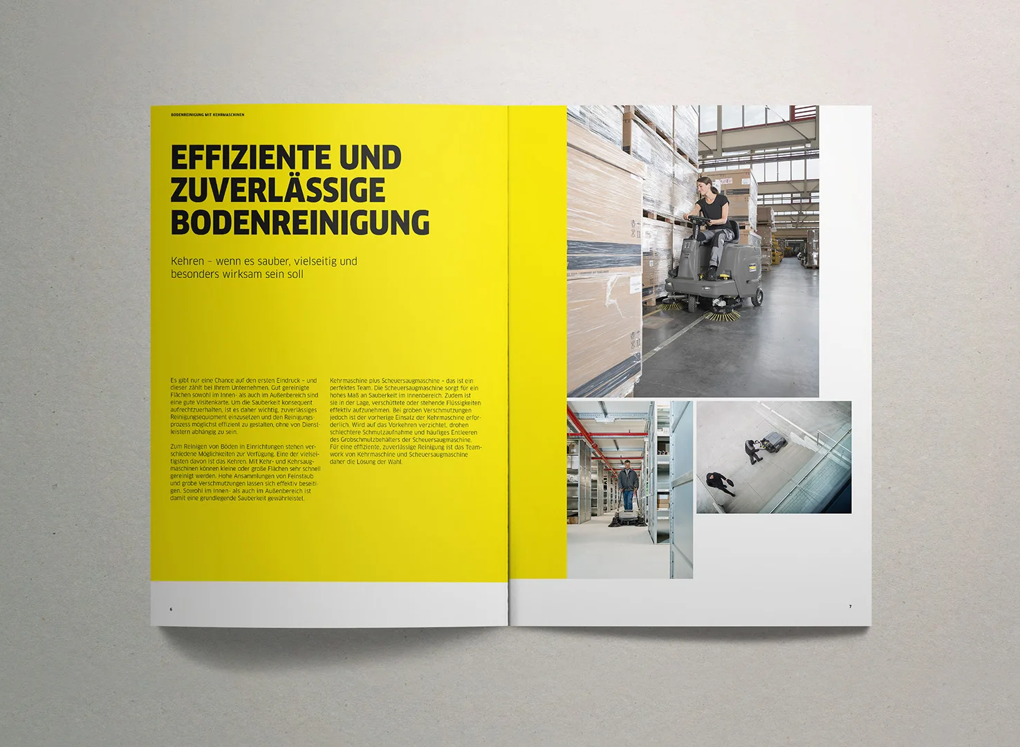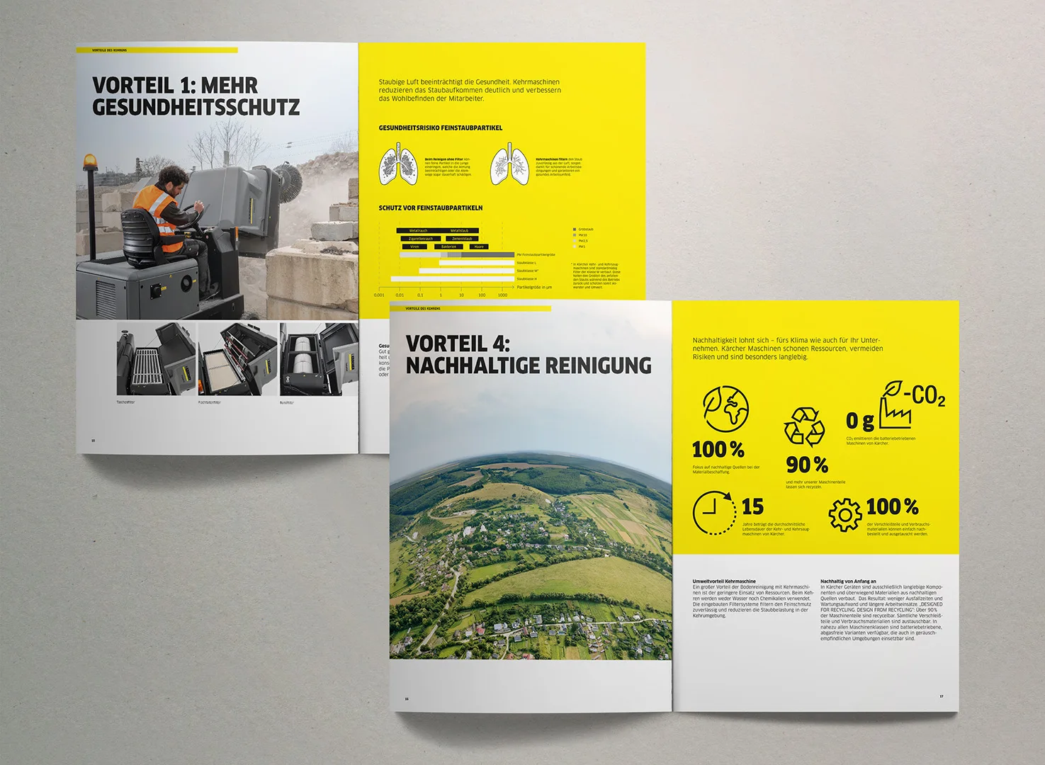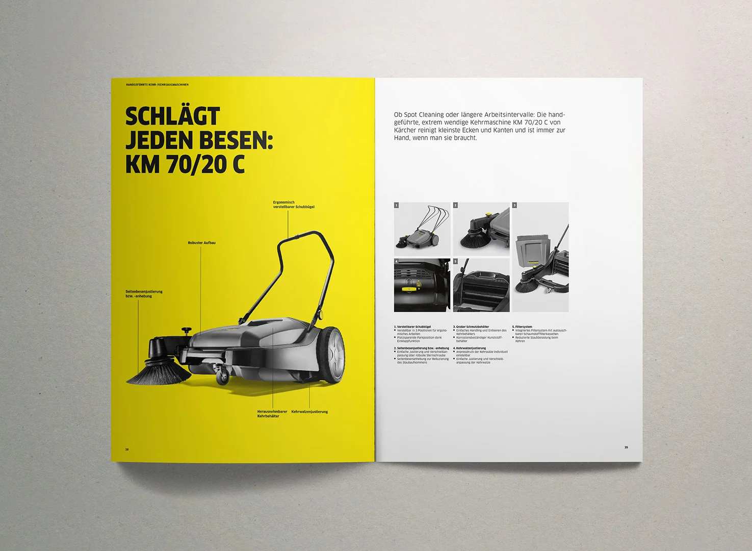 Gesundheitsschonend, produktiv, wirtschaftlich und nachhaltig: die Broschüre zeigt anschaulich die Vorteile von Kehrmaschinen für eine effiziente und zuverlässige Bodenreinigung. Pro Geräteklasse wird eine exemplarische Maschine detailliert vorgestellt. Großzügige Bildwelten und gelbe Farbflächen werden mit plakativen Darstellungen und Detailbildern der Kehrmaschinen kombiniert und bringen das Kärcher Corporate Design auf den Punkt. Prägnante Key Facts und Piktogramme sowie Grafiken runden das stimmige Gesamtkonzept ab.