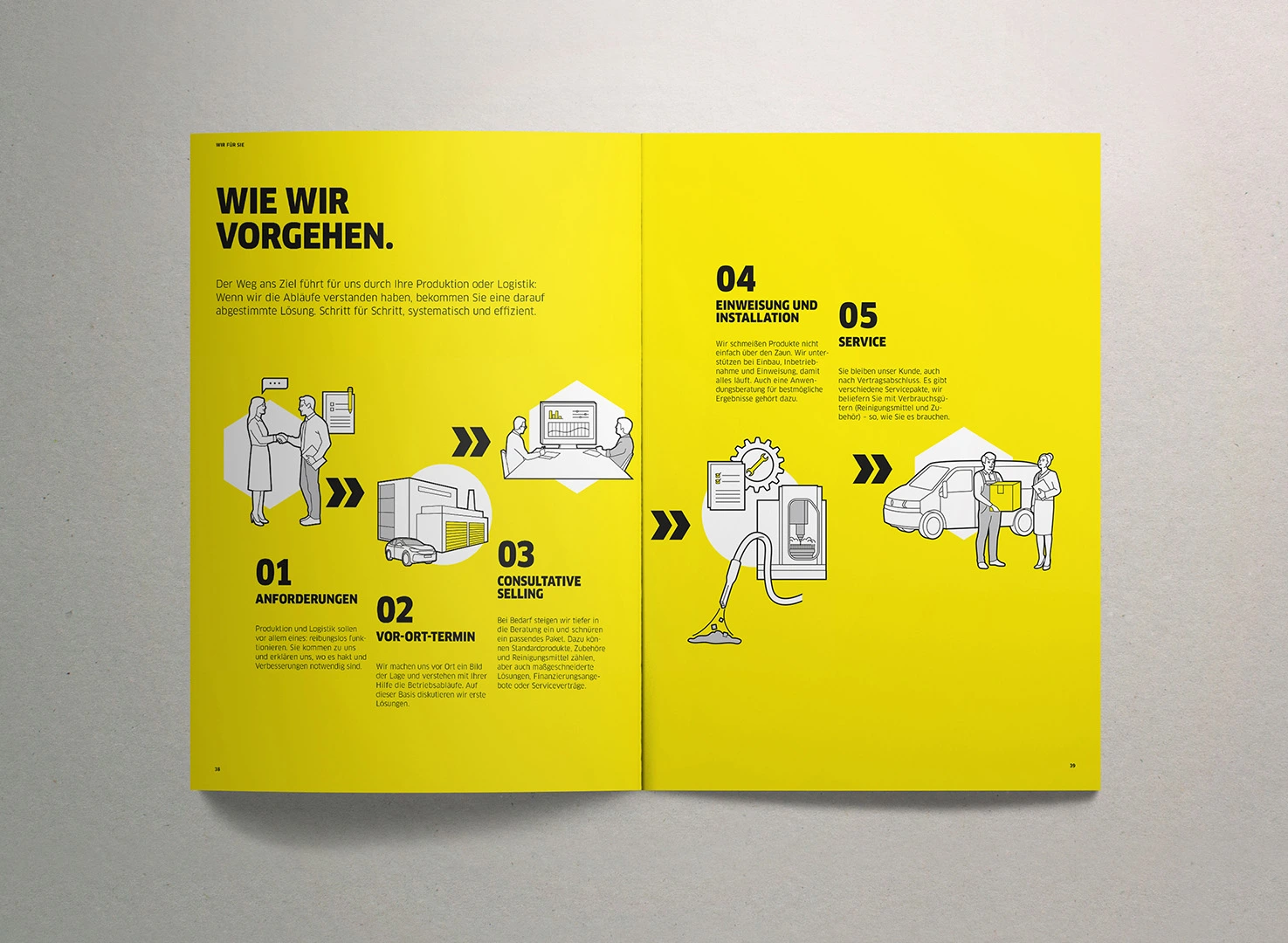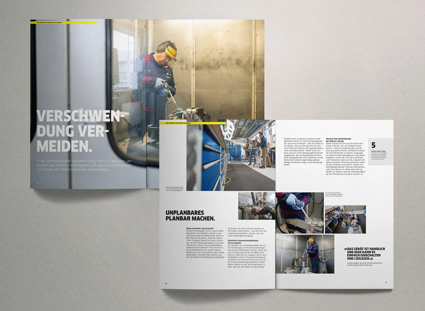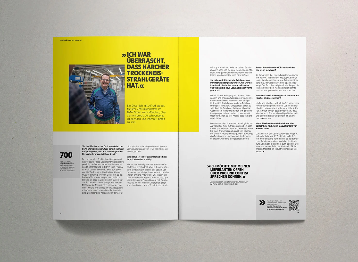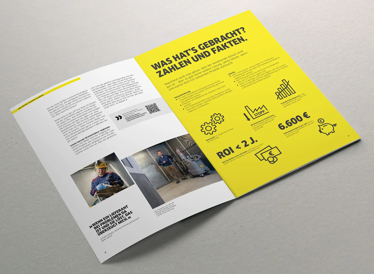 Saubere Prozesse, saubere Industrie – die Broschüre zeigt eindrucksvoll, wie Kärcher gemeinsam mit seinen Kunden maßgeschneiderte Reinigungs- und Hygienelösungen für die komplexen Abläufe in der Industrie entwickelt, für die ein Standard-Reinigungsgerät oft nicht ausreicht. In spannenden Interviews und Fallstudien im Reportage-Stil geben Kunden aus verschiedenen Branchen wie Automotive, Lebensmittel und Chemie einen Einblick, wie sie ihre individuelle und für ihren Bedarf perfekte Kärcher-Lösung gefunden haben. Plakative Zahlen- und Faktenseiten fassen die Herausforderungen und Lösungen am Ende der einzelnen Cases übersichtlich zusammen – anschaulich visualisiert mit Piktogrammen.