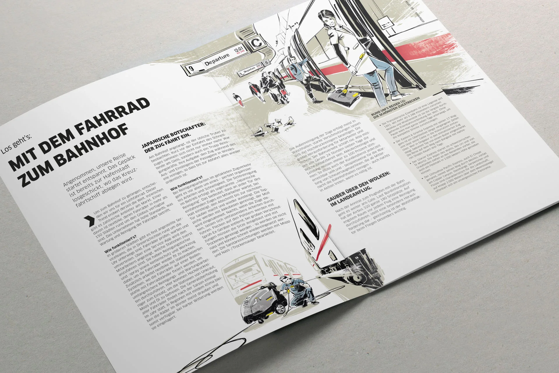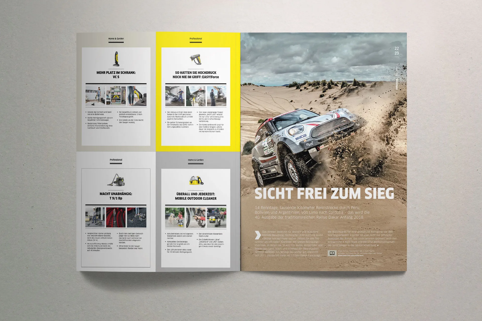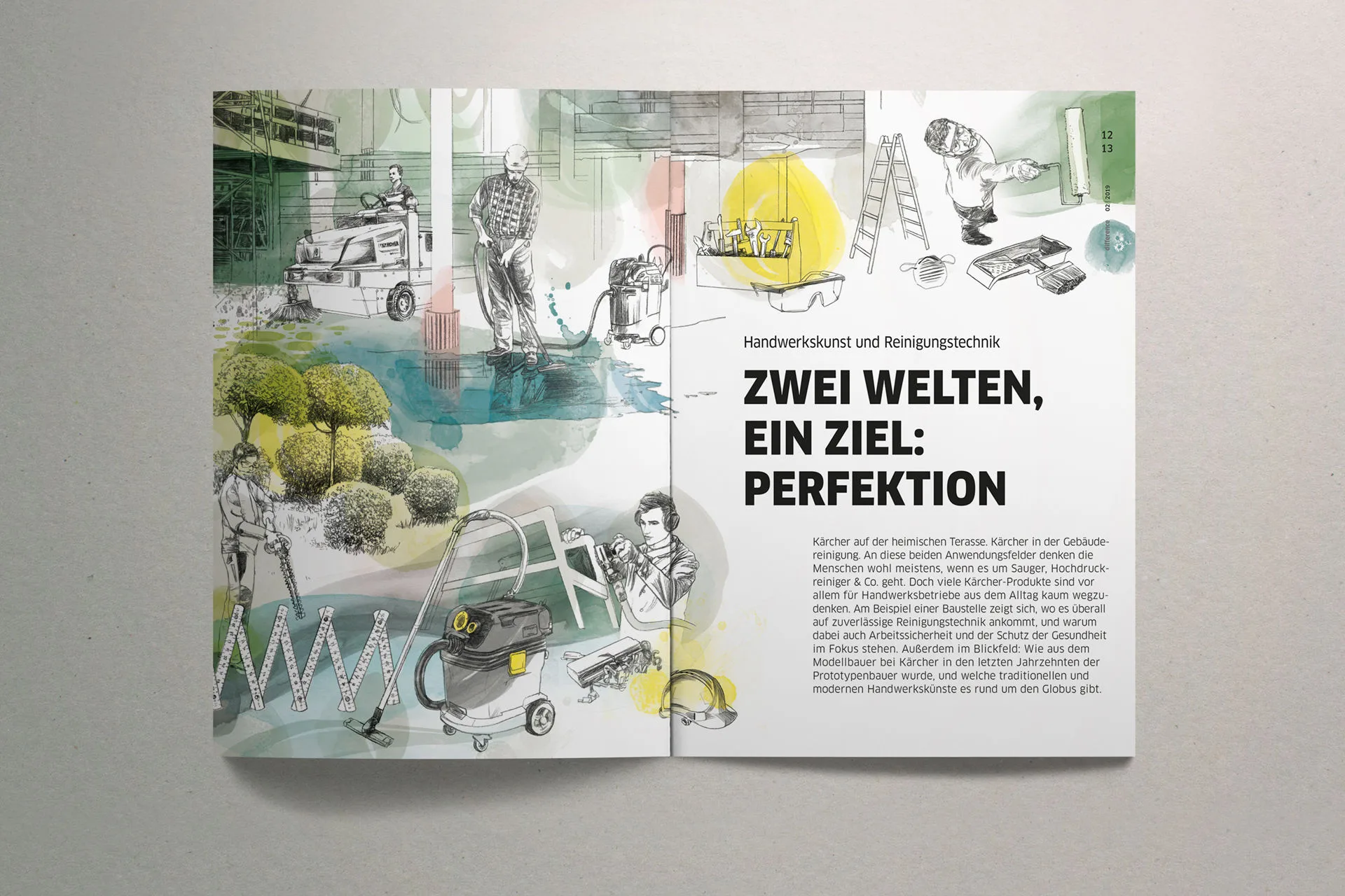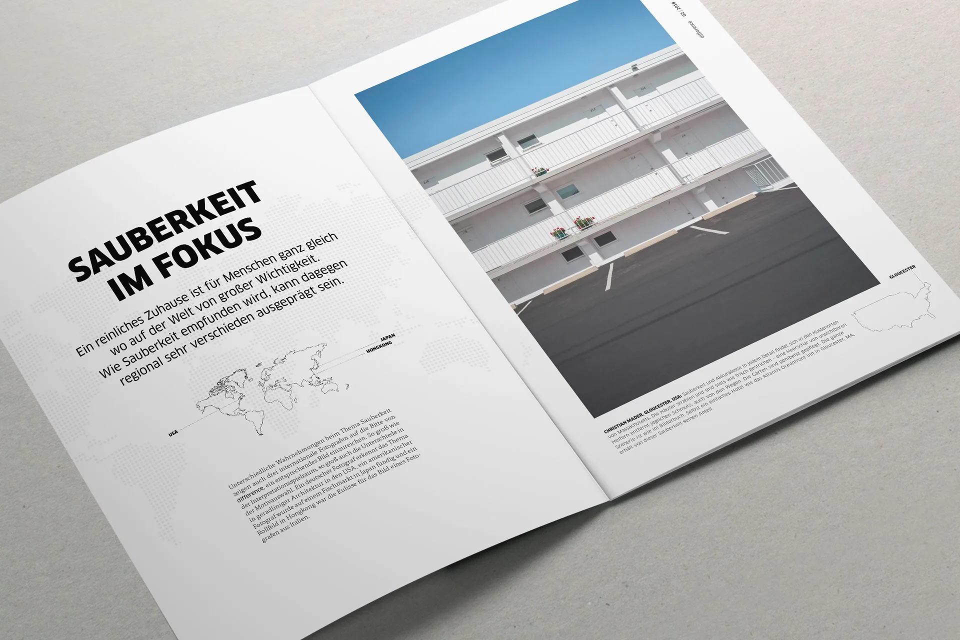 Editorial Design vom Feinsten: Das monothematische Kärcher Kundenmagazin »difference« legt den Fokus auf abwechslungsreiches Storytelling mit spannenden Geschichten und großzügigen Bildwelten. Übergreifende Themen wie »Horizonte« oder »Zeit« werden im Innenteil mit Fotografie, Illustration oder Collagen kreativ bespielt und schaffen inhaltlich eine Verbindung zu dem weltweit führenden Anbieter für Reinigungstechnik. Für einen magazinigen Look wurde das Corporate Design für die hochwertige Publikation um zwei Schriften und einige Farben erweitert und durfte hier ein weniger freier umgesetzt werden. Das Magazin erschien weltweit in mehreren Sprachen zwei Mal pro Jahr. Die Titel-Story und die wichtigsten Artikel wurden zusätzlich online in den Kärcher Themenwelten bespielt und teilweise durch weitere Inhalte ergänzt.