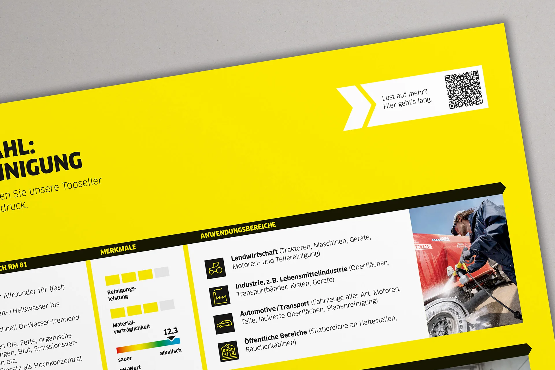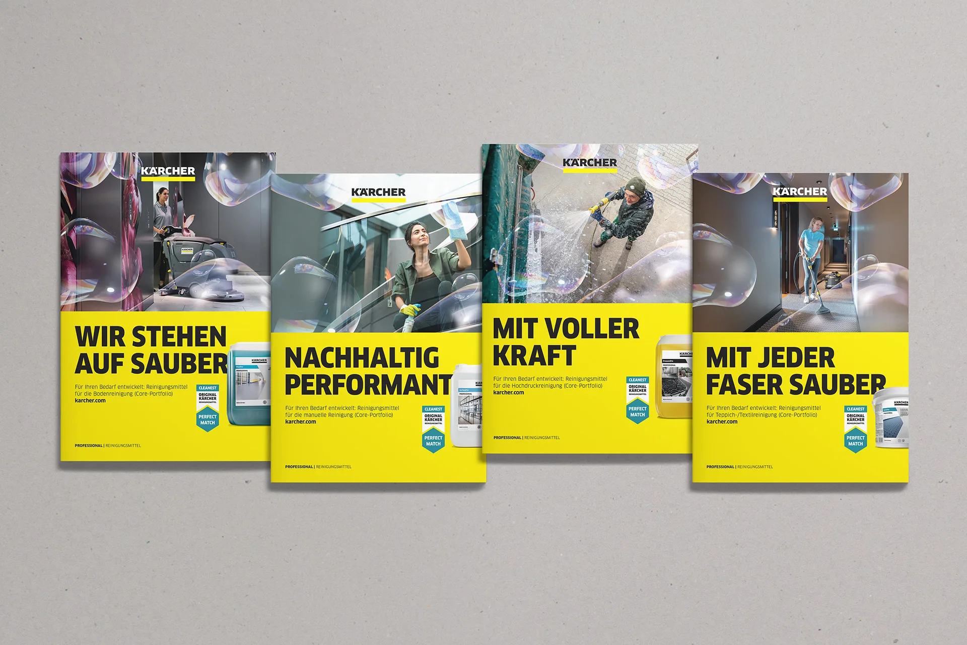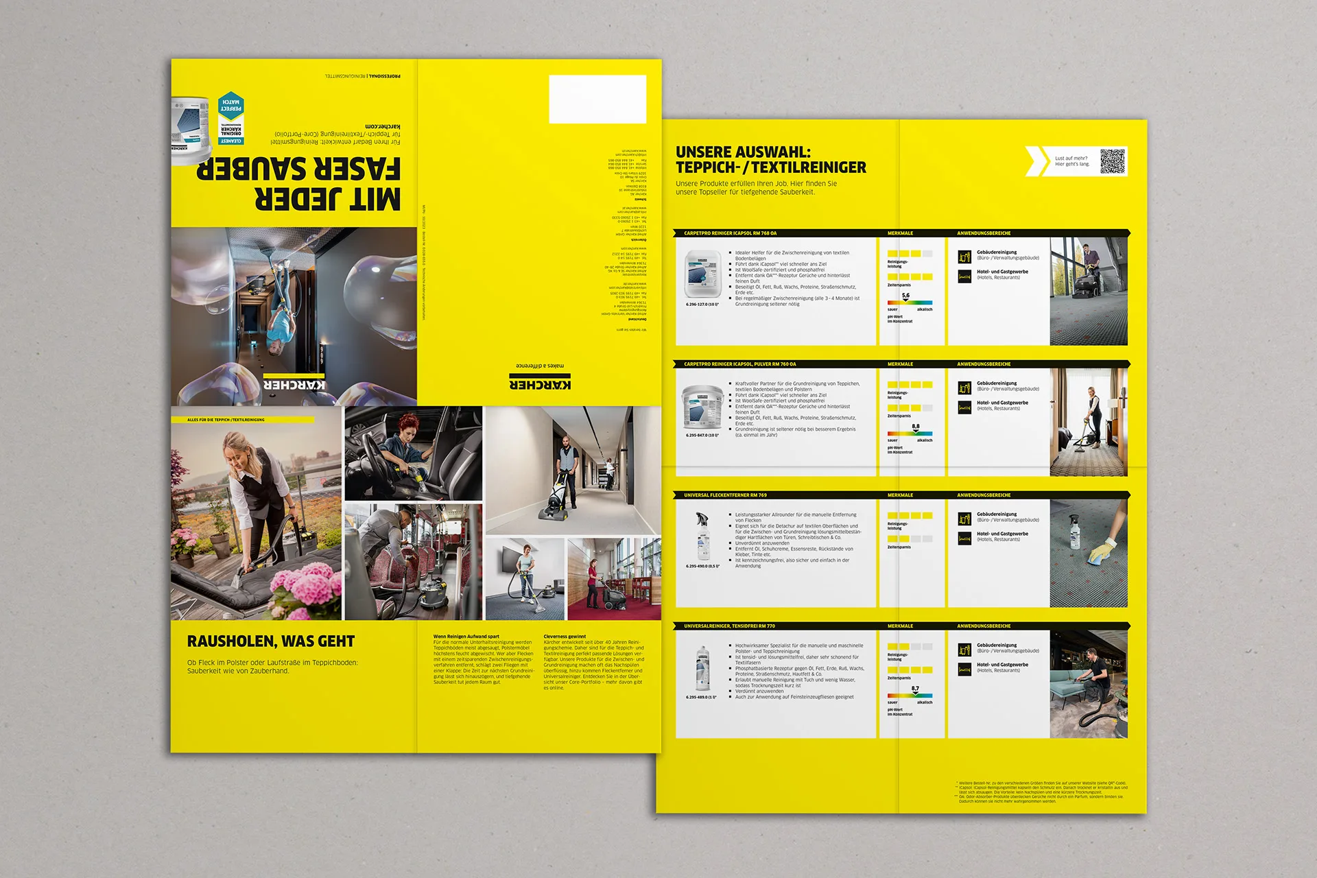 Die Aufgabe: ein geeignetes Printmedium zu finden und ein Designkonzept zu schaffen, bei dem die wichtigsten Reinigungsmittel für vier Gerätekategorien übersichtlich und leicht verständlich dargestellt werden. Entwickelt wurde ein Set aus vier kompakten DIN A5-Broschüren, die jeweils zu einem DIN A3-Poster aufgefaltet werden können. Durch eine klare Visualisierung und intuitive Grafiken können die Produkte innerhalb einer Kategorie schnell und einfach miteinander verglichen werden. Die Poster transportieren die zentralen Botschaften: Mit dem Original von Kärcher erhält man das optimal auf das Gerät abgestimmte Reinigungsmittel und deckt mit wenigen Produkten eine Vielzahl von Anwendungsbereichen ab.