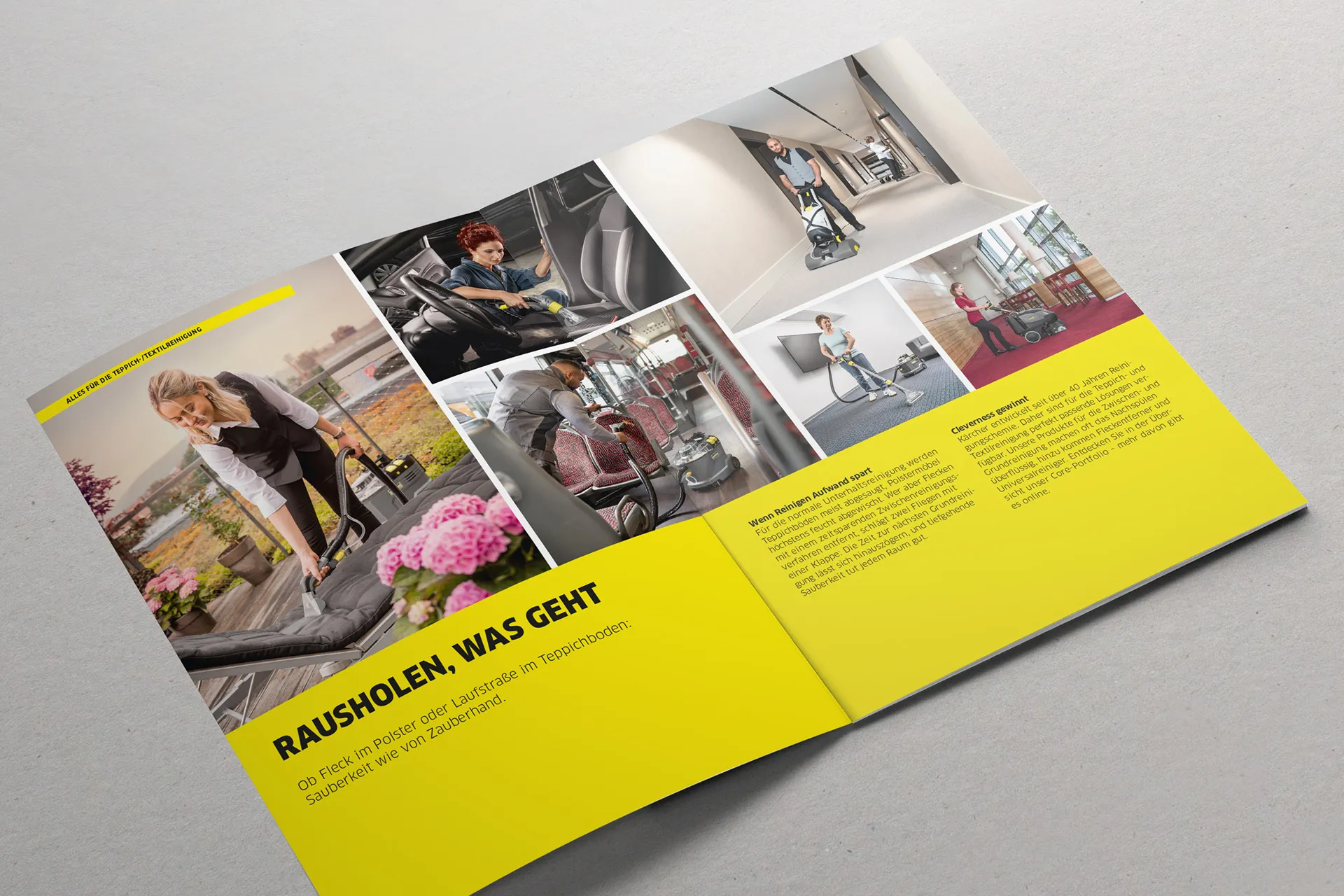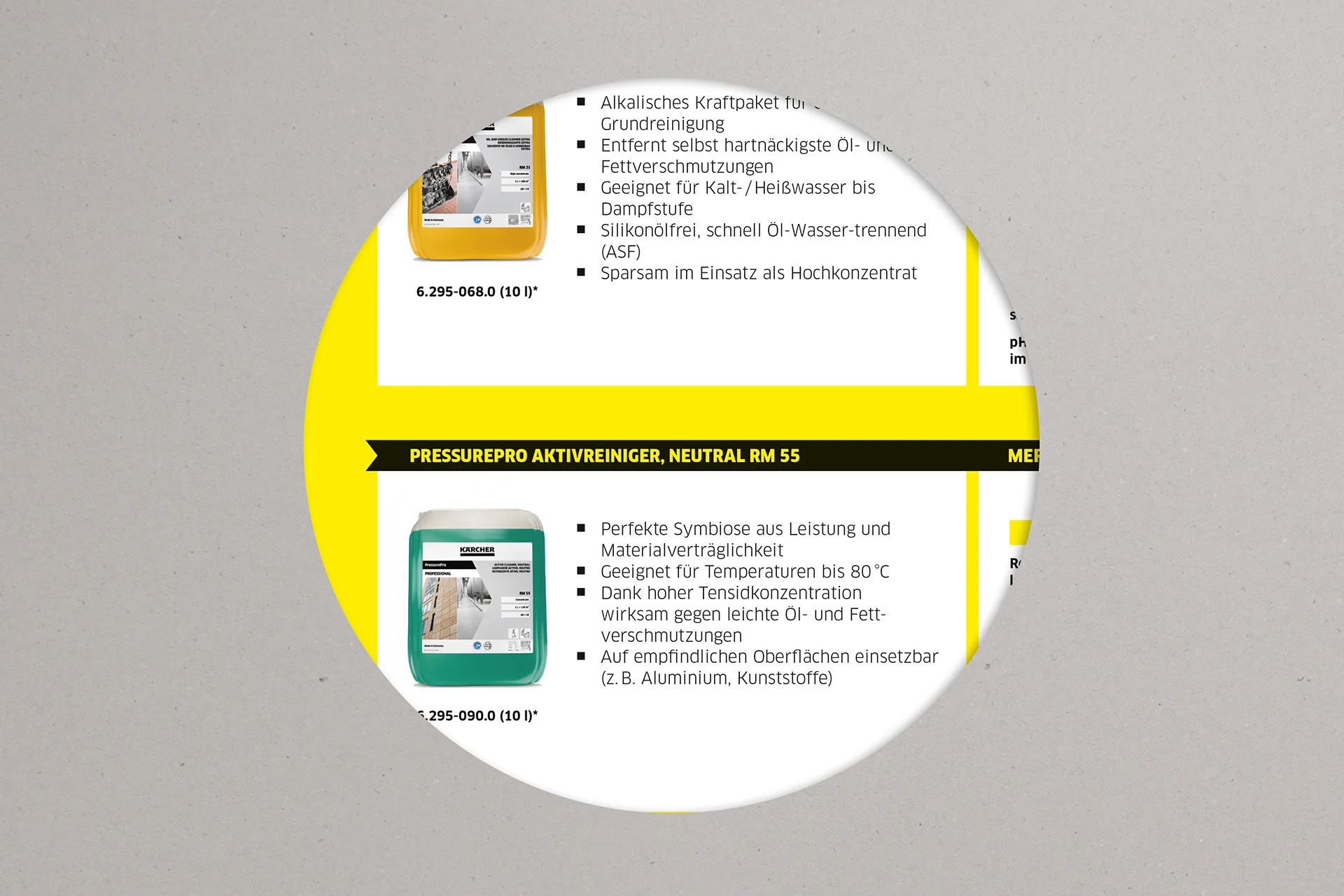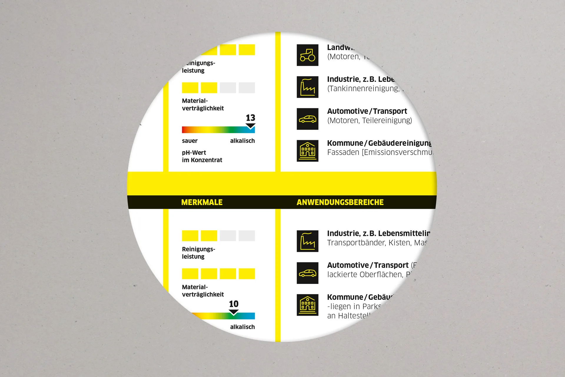 Die Aufgabe: ein geeignetes Printmedium zu finden und ein Designkonzept zu schaffen, bei dem die wichtigsten Reinigungsmittel für vier Gerätekategorien übersichtlich und leicht verständlich dargestellt werden. Entwickelt wurde ein Set aus vier kompakten DIN A5-Broschüren, die jeweils zu einem DIN A3-Poster aufgefaltet werden können. Durch eine klare Visualisierung und intuitive Grafiken können die Produkte innerhalb einer Kategorie schnell und einfach miteinander verglichen werden. Die Poster transportieren die zentralen Botschaften: Mit dem Original von Kärcher erhält man das optimal auf das Gerät abgestimmte Reinigungsmittel und deckt mit wenigen Produkten eine Vielzahl von Anwendungsbereichen ab.