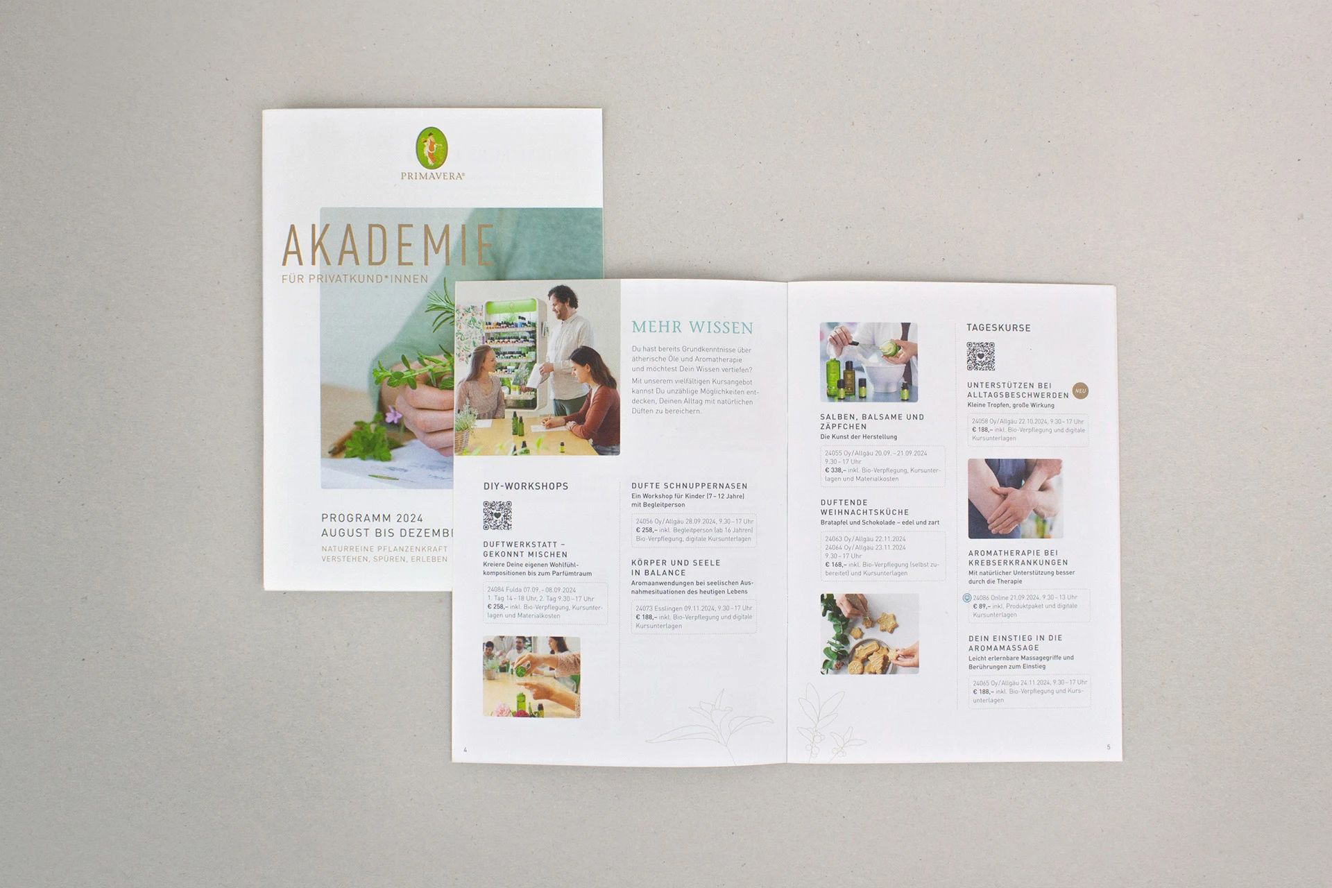 Die PRIMAVERA AKADEMIE vermittelt in ihren Kursen, Seminaren und exklusiven Duftreisen praxisnah wertvolles Wissen zu ätherischen Ölen, Aromatherapie und Bio- & Naturkosmetik. Im 64-seitigen Akademieprogramm wird das breite Angebotsspektrum vorgestellt, dass sich sowohl an Fach- als auch an Privatkund*innen richtet.