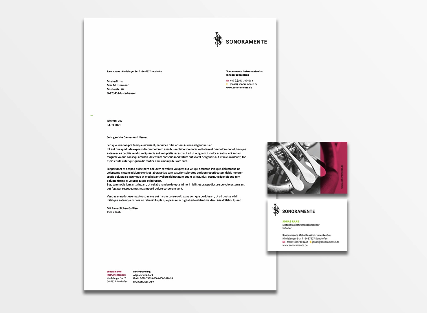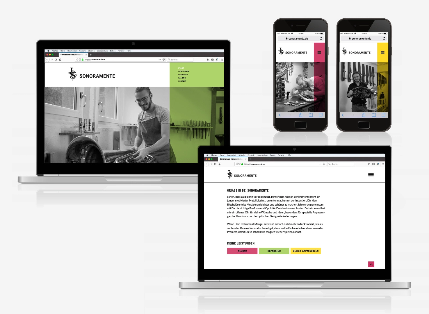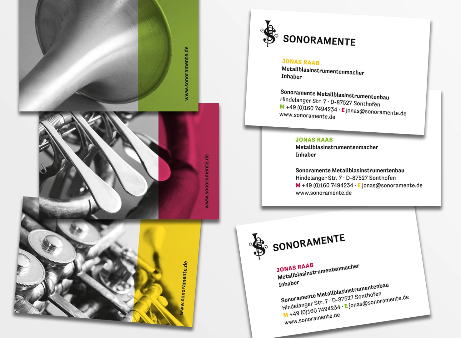Bei der Markenentwicklung für einen jungen Metallblasinstrumentenbauer stand das Ziel im Vordergrund, seine Leidenschaft zur Musik und zu seinem Handwerk spürbar zu machen. Dazu passend wurde der klangvolle Firmenname „Sonoramente“ gewählt, der im Italienischen „klingend, tönend“ bedeutet. USP des Inhabers: maßgefertigte Anpassungen für Musiker*innen mit körperlichen Handicaps und individuelle Designs, die jedes Instrument einzigartig machen.