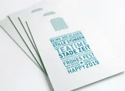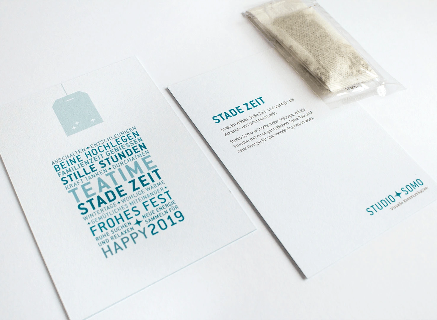 Die jährlichen Weihnachtsgrüße von Studio Somo enthalten eine kleine Aufmerksamkeit, die zusammen mit der Grußkarte in einem Briefumschlag verschickt werden kann. Mit reduzierter, typografischer Gestaltung bezieht sich die hochwertige, 600 g/m²-starke Weihnachtskarte mit Farbkern thematisch auf das Give-away und lässt noch Platz für eine persönliche Nachricht auf der Rückseite.